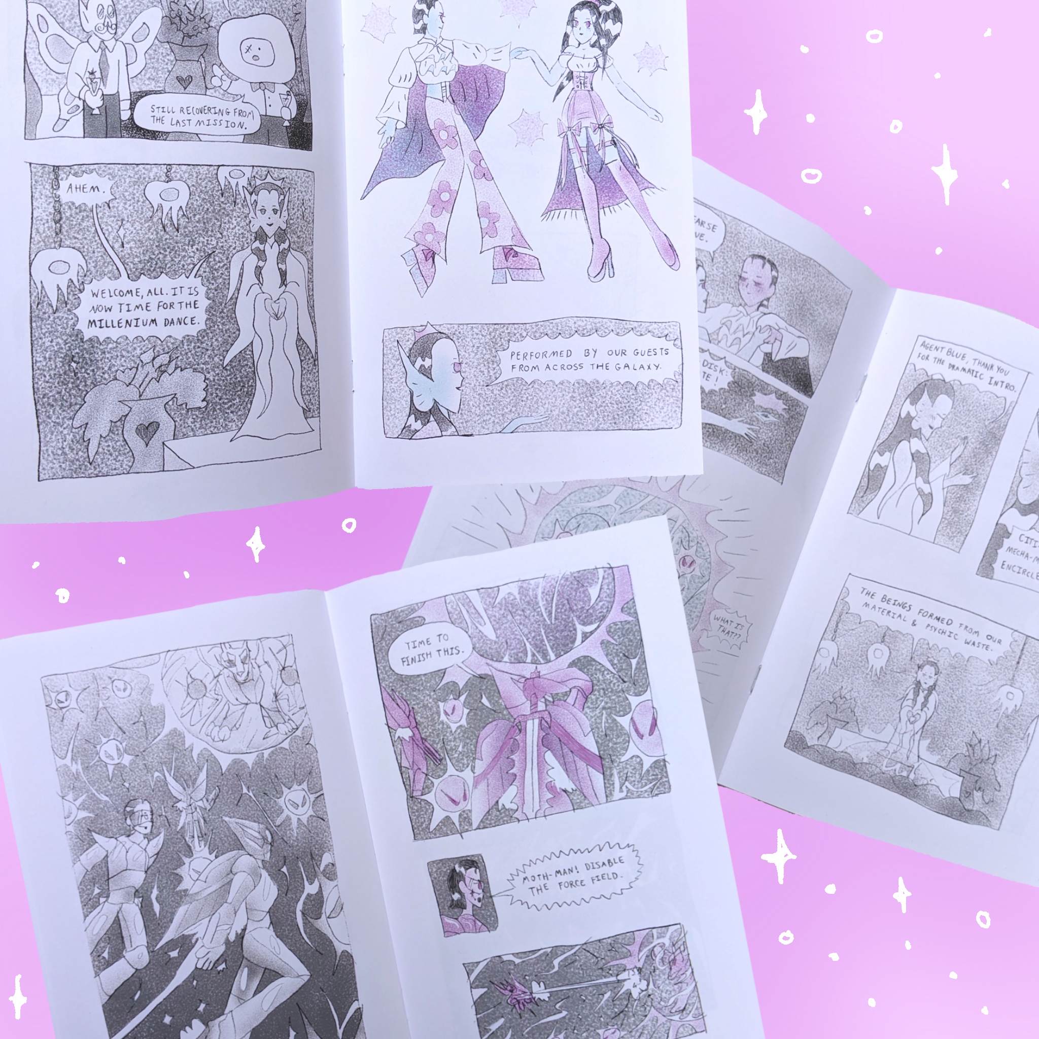 20 page long science fiction zine. "Our heroes have found themselves on an unexpected detour after a crash landing in a distant galaxy. Once every thousand years, diplomats gather from across the planet. Are they aware of the looming threat in their atmosphere?"